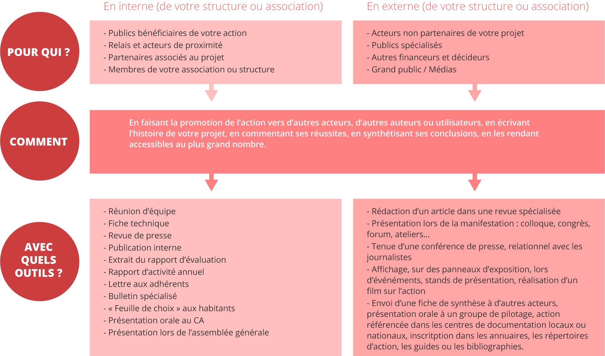 La valorisation d'une action passe vraisemblablement par la mise en avant de ses auteurs ou, mieux encore, de ses bénéficiaires et des résultats acquis. Il peut s'agir d'un processus, d'un partenariat, d'un changement de comportement, du développement de connaissances, d'une modification dans les représentations… Il faut privilégier d'abord une valorisation en interne avant de créer des supports pour d'autres cibles à l'extérieur.