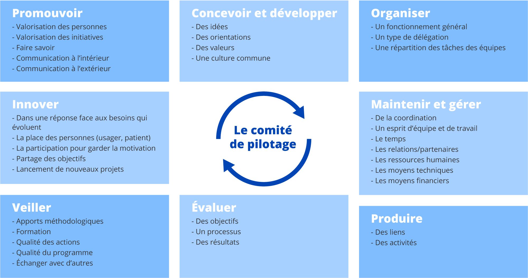 Il peut être de taille réduite (élus, responsables, partenaires financiers) ou composé d’un plus grand nombre d’acteurs (représentation des citoyens, partenaires opérationnels, experts du sujet…)